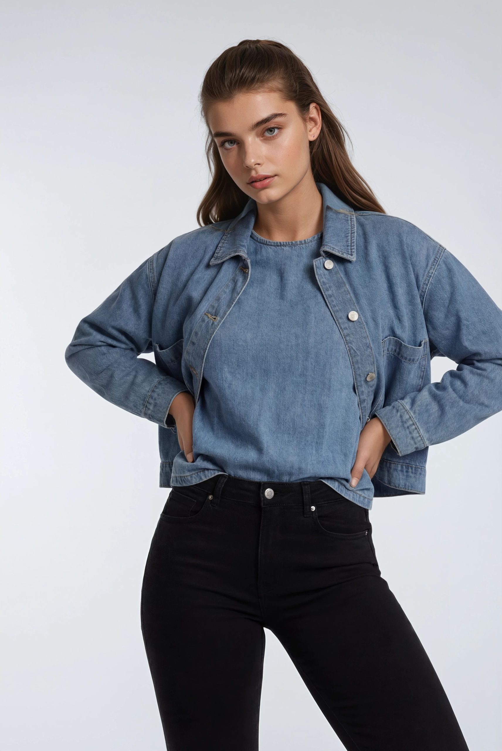 ג׳קט ג׳ינס אוברסייז אופנתי בעיצוב מינימליסטי עם דגש על נוחות. הדגם עשוי מבד ג׳ינס צפוף השומר על הצורה ומתאים ללבישה יומיומית. הגזרה החופשית וקו הכתפיים הנמוך יוצרים סילואט משוחרר ונפח עדכני. הג׳קט מהווה פריט בסיסי ורב־שימושי ללוקים בשכבות ומשתלב בקלות הן עם סטים מג׳ינס והן עם פריטים נשיים יותר במלתחה.