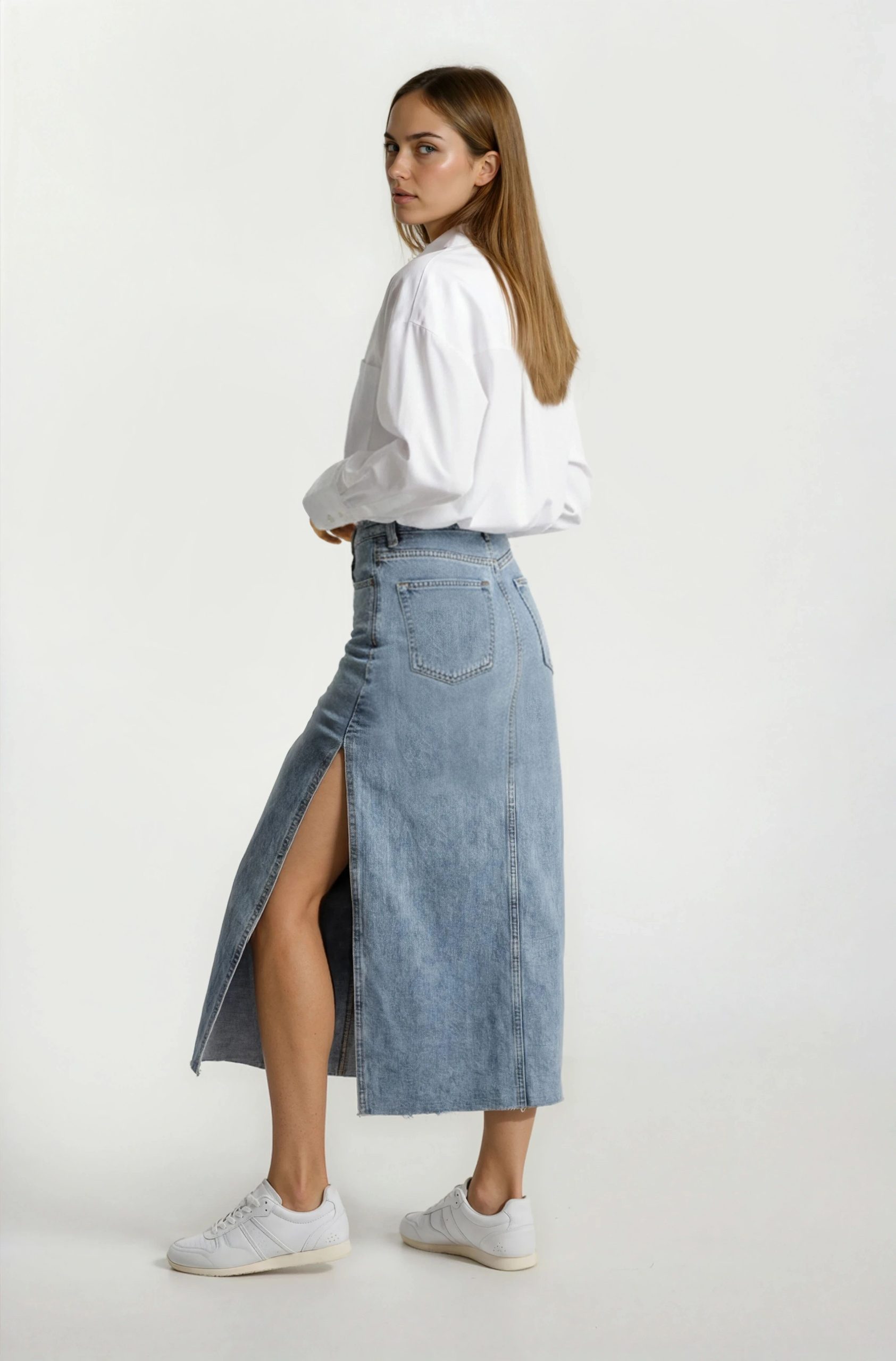 חצאית ג׳ינס מידי עם שסע צדדי — דגם אופנתי מבד דנים רך ואלסטי. החצאית מדגישה את קווי הגוף ומתיישבת בנוחות על המותניים והירכיים בזכות תוספת הסטרץ'. השסע הצדדי מוסיף קלילות וחופש תנועה, והופך את החצאית לנוחה ללבישה יומיומית.