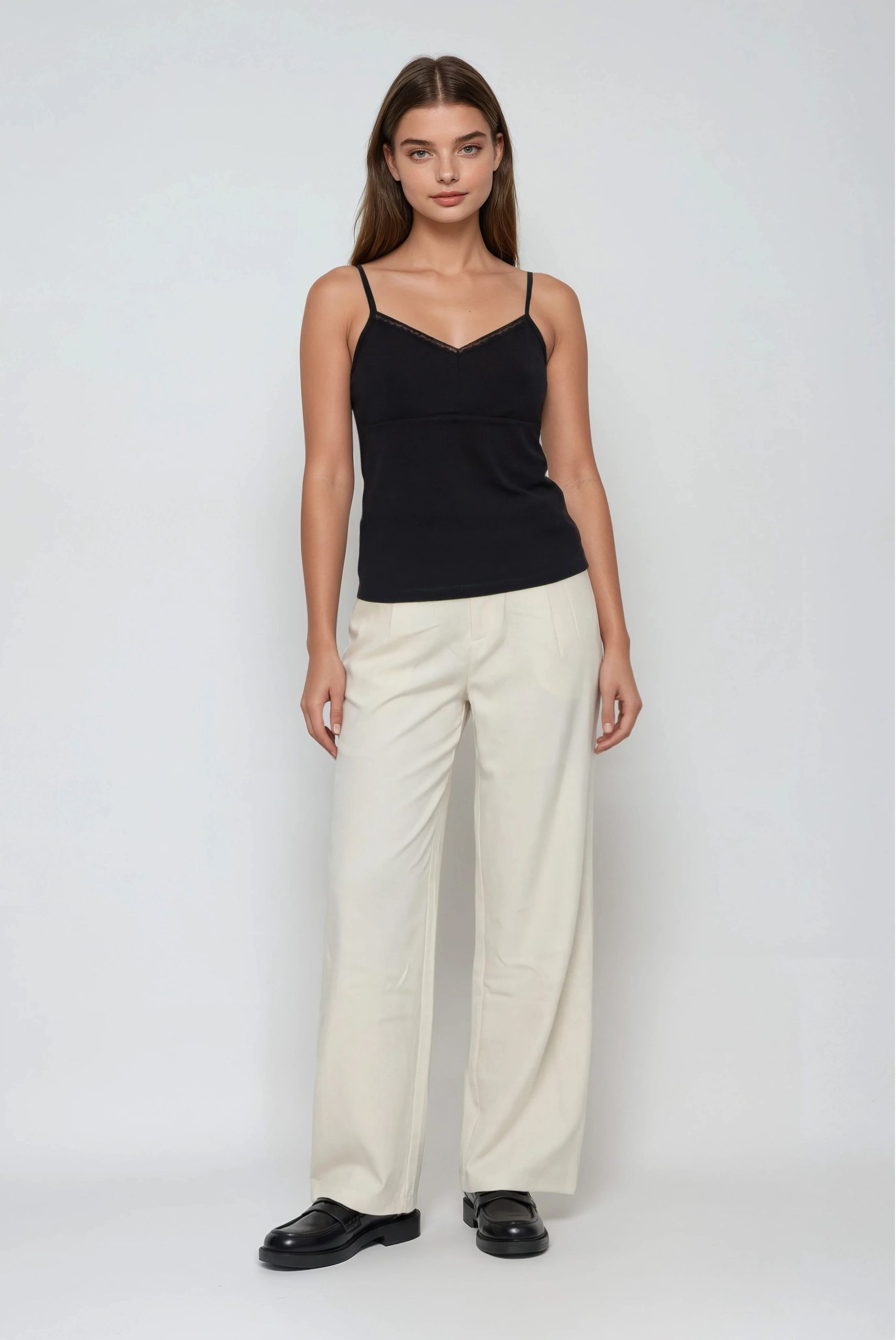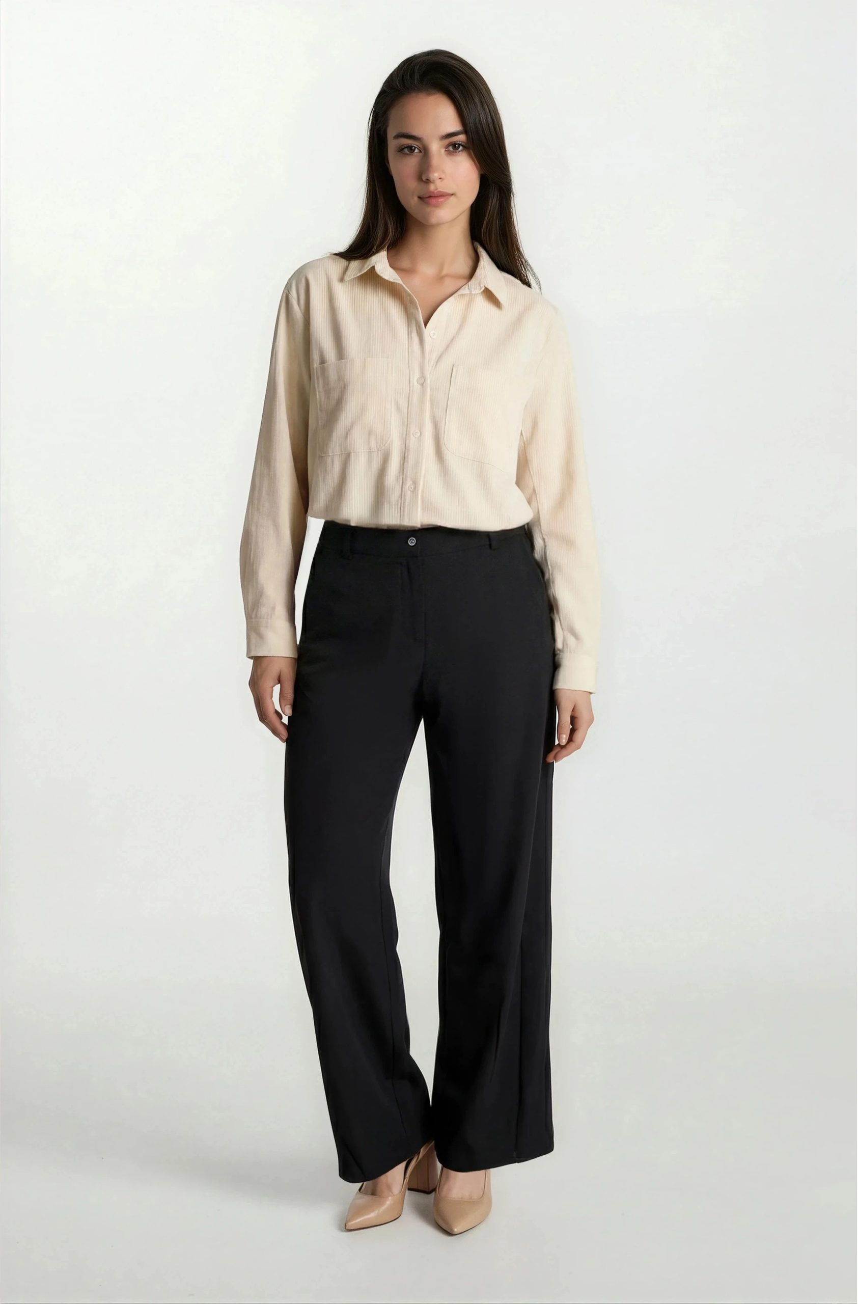 מכנסיים קלאסיים עם קפלים מסודרים בחזית ורגליים ישרות. הדגם בעל עיצוב נקי ומדויק המדגיש את קו המותן ומאריך ויזואלית את הסילואט. גזרה אוניברסלית המשתלבת בקלות הן עם ז’קטים וחולצות מכופתרות והן עם טופים משוחררים יותר.